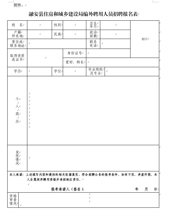 (1)報名方式:應聘者將報名表等相關材料發送至融安縣住建局郵箱:raxjsj@163.com,報名材料主要包括:報名表(請自行下載填寫,并手寫簽名)、身份證、學歷學位證書、資格證書、獲獎證書等。以上材料均需掃描成PDF版本。