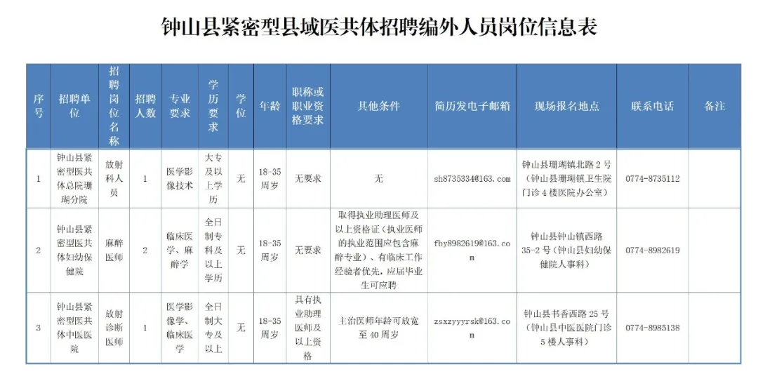 5.崗位具體信息及要求詳見附件1《鐘山縣緊密型縣域醫共體招聘編外人員崗位信息表》(如下圖)。