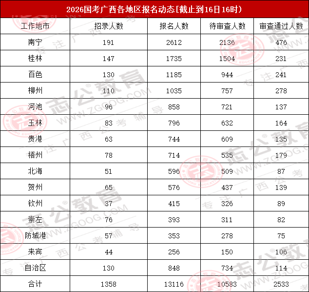 截止到16日16時,2026國考廣西地區各地市報名人數最多的地市為南寧、桂林、百色,其中南寧報名人數為2612人,位居第一!整體報考人數達13116人!對此,小志建議大家,報考崗位時需將自身職業愿景與個人實際條件(如專業、學歷、基層經驗等)緊密結合,理性分析崗位競爭情況,最終做出最適合自己的選擇。