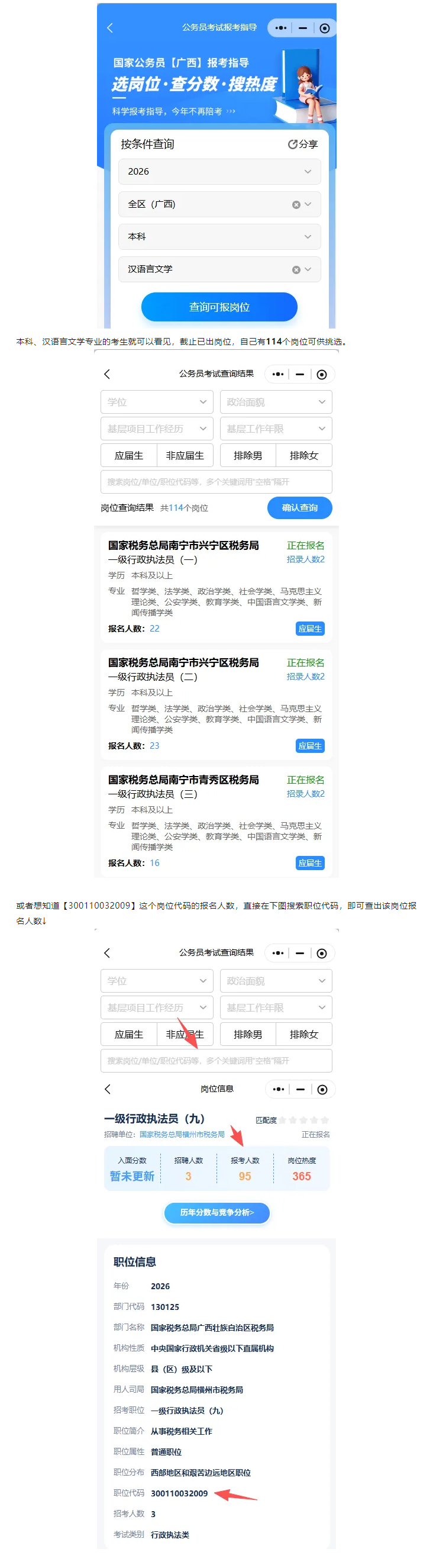 因為是處于國考選崗階段,我們更想知道選崗功能,思路是【選擇學歷】-【選擇專業】/輸入崗位代碼即可看見想查看的崗位,自己查看可以報名的大致崗位范圍及具體崗位的報名人數,下面以2026年國考(廣西)崗位為例,比如,你是本科、漢語言文學專業的考生,選擇學歷-【本科】輸入【漢語言文學】選擇彈出來的分類目錄。