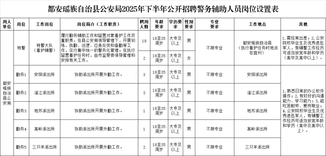 都安瑤族自治縣公安局本次擬招聘警務輔助人員30人,具體招聘崗位、人數、資格條件詳見《都安瑤族自治縣公安局2025年下半年公開招聘警務輔助人員崗位設置表》。