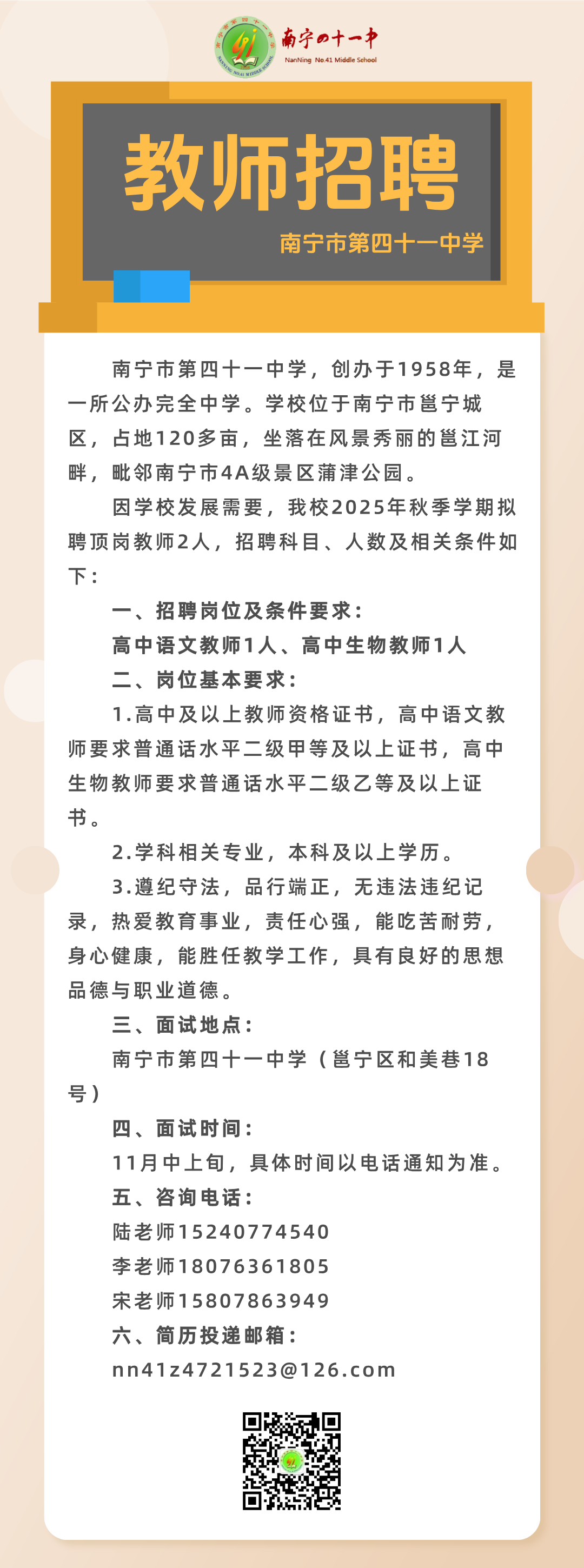原文標題:2025年秋季學期南寧市第四十一中學關于公開招聘頂崗教師的啟事