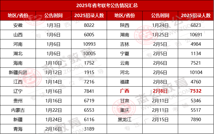 由廣西壯族自治區(qū)公務(wù)員局發(fā)布,核心查詢平臺為八桂先鋒網(wǎng)、廣西人事考試網(wǎng),也可在各市黨建網(wǎng)、人事考試相關(guān)平臺查看。2025年公告發(fā)布時間為2月8日。