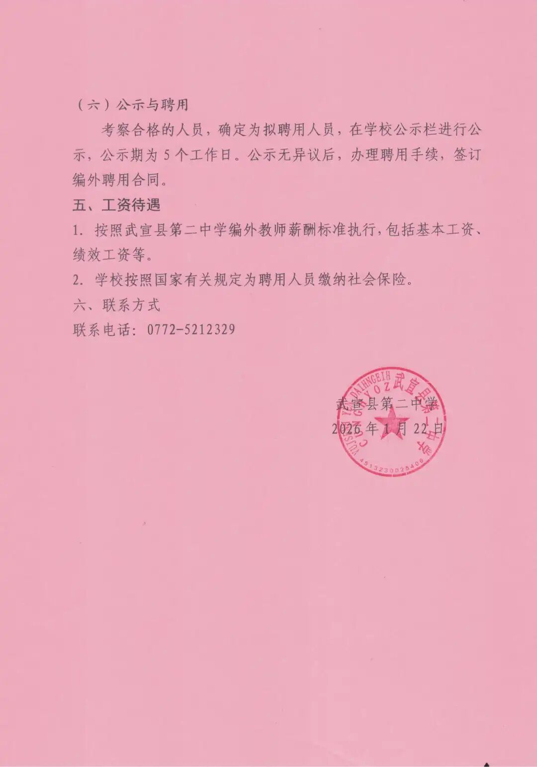 2026年來賓武宣縣第二中學編外(頂崗)教師招聘3人