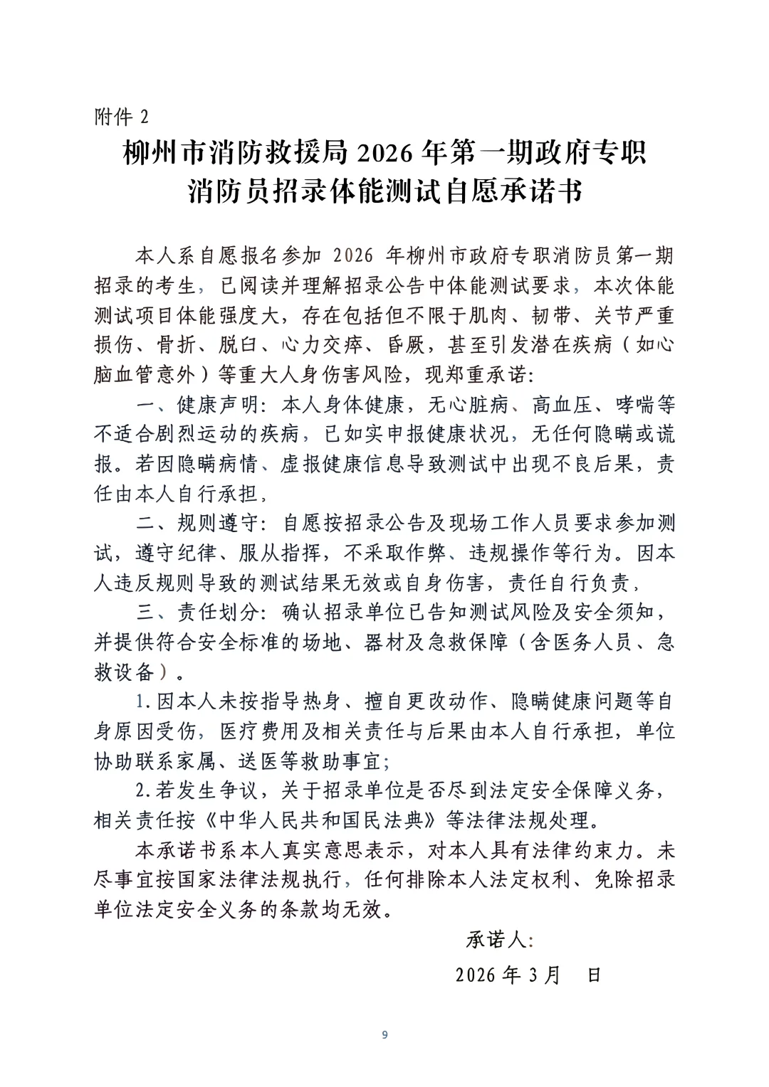 考生在體能測評前需簽署體能柳州市政府專職消防員第一期招錄體能測試承諾書,拒絕簽署的不予進行考核詳見(附件2)。