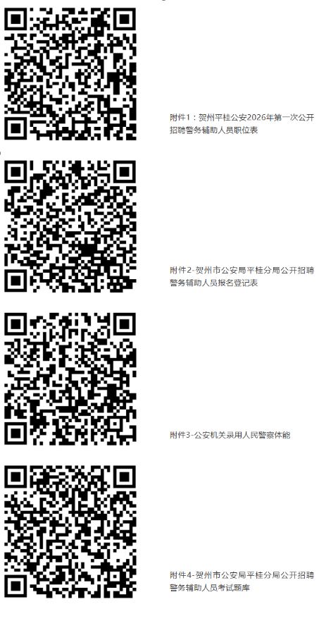 報考人員自2026年1月26日起,可通過賀州市公共就業和人才服務中心“賀州市微就業”官方微信(gxhzjy)、賀州市公安局平桂分局“平桂警方”官方微信(pggafj)查閱招聘簡章及《職位計劃表》(附件1)等相關招聘信息。