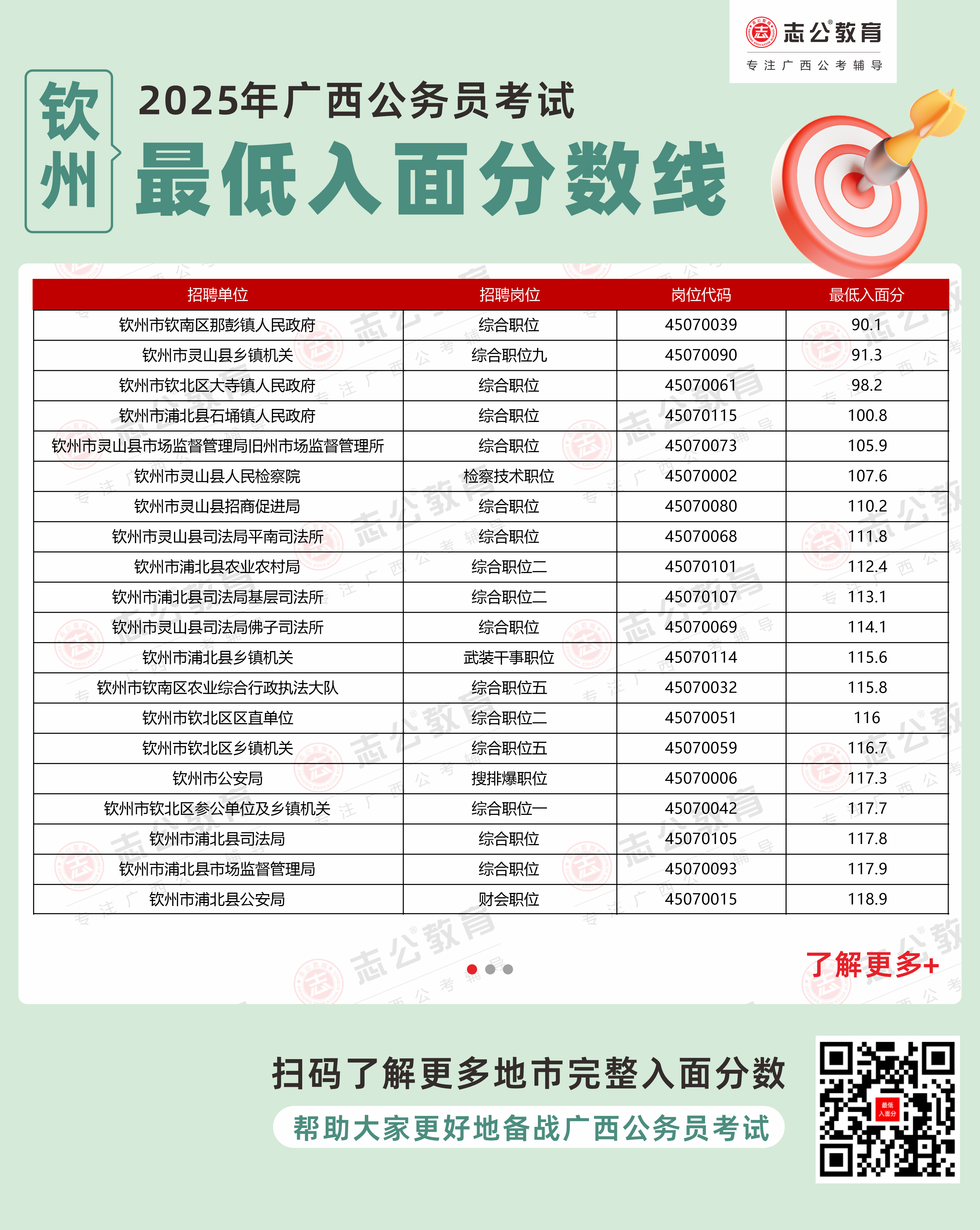 以下為志公教育根據(jù)官方發(fā)布的面試資格審查名單整理的欽州市部分單位的進面最低筆試分數(shù)(含照顧加分),數(shù)據(jù)僅供參考,具體以官方實際公布為準。