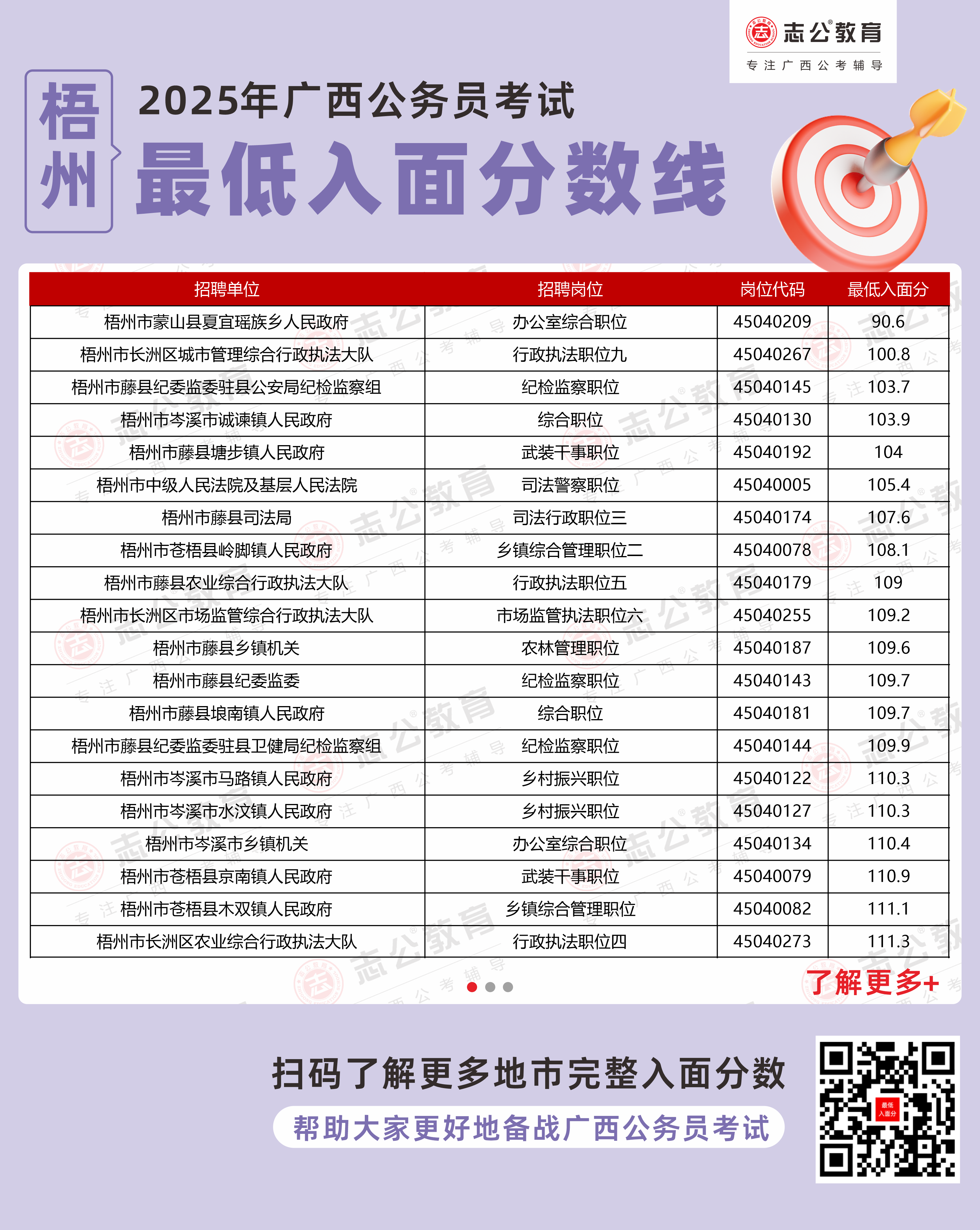 以下為志公教育根據官方發布的面試資格審查公告及公開數據整理的梧州市部分單位的進面最低筆試分數(含照顧加分),數據僅供參考,具體以官方實際公布為準。