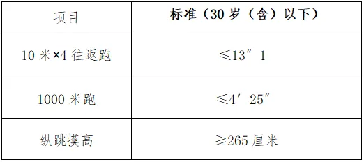 體能測評項(xiàng)目中,縱跳摸高的測試次數(shù)不超過3次,10米×4往返跑測評次數(shù)為2次,1000米跑的測評次數(shù)為1次。應(yīng)聘人員體能測評三項(xiàng)全部達(dá)標(biāo)的方為合格。